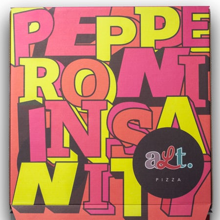 Đặt tên cho văn hóa thay thế, ALT. Pizza phục vụ tất cả các loại bánh pizza khác nhau có sẵn trên bờ biển phía tây của Mỹ. Mỗi nhân vật typographic là khác nhau đáng kể trong phong cách. Biểu tượng giàu tính tưởng tượng lấy cảm hướng từ âm nhạc punk rock mang lại nét độc đáo cho logo Pizza này.