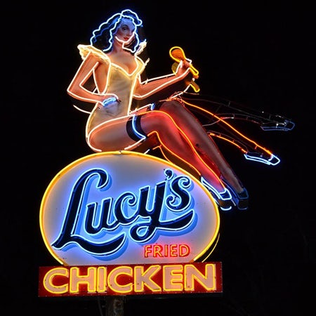 Logo Fried Chicken của Lucy là một ví dụ tuyệt vời về thiết kế hiện đại có thể nhìn thấy ngay tại nhà trong bối cảnh năm 1950 cổ điển. Để phù hợp với phong cách gà rán, logo kết hợp kịch bản và kiểu chữ retro (cân bằng trọng lượng, hình dạng và khoảng cách của mỗi dạng chữ giữ cảm giác hiện đại). Các dấu hiệu neon và cái nhìn pinup cổ điển hoàn thành bản sắc thương hiệu thú vị này.