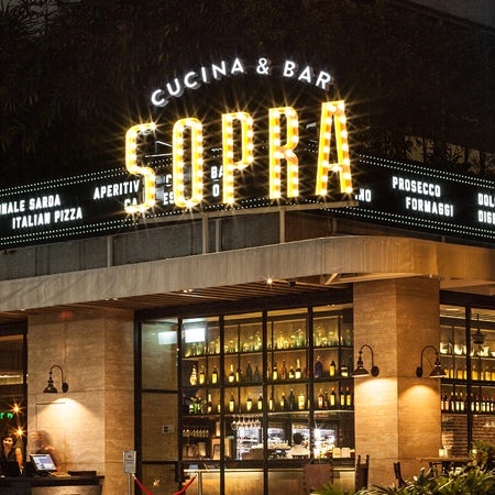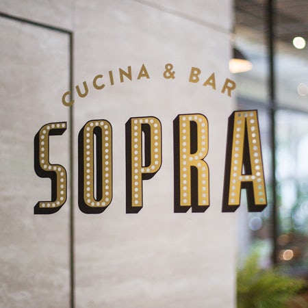Thắp sáng với vẻ đẹp quyến rũ của trường học cổ Hollywood hay vẻ lấp lánh của kim loại, logo của Sopra là một biểu tượng cho sự sang trọng của thời kỳ hậu chiến Italy. Bạn không cần phải đi đến nước xuất xứ để trải nghiệm thực phẩm đích thực. Nhờ có các chuyên gia thiết kế, các nhà hàng như Sopra có thể tái tạo lại sự mê hoặc của điện ảnh Ý cũ.